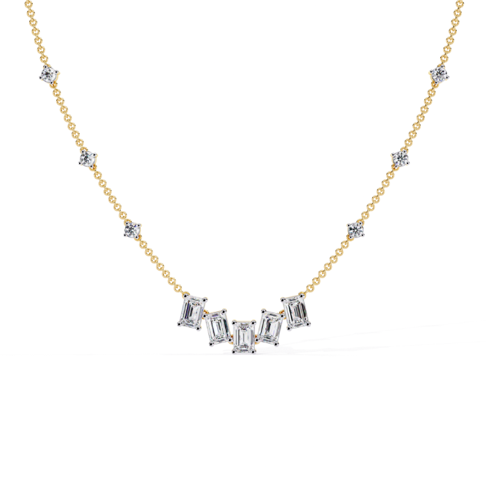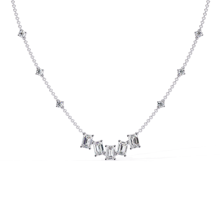 Adorn your neckline with the sophisticated sparkle of the “Cascade” Emerald Cut Moissanite Necklace